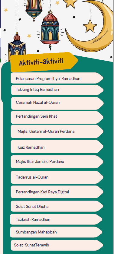 - Menjadikan sambutan sebagai wahana untuk mengisi kekosongan jiwa bagi meningkatkan penghayatan Ramadan dalam kalangan warga pendidik dan murid.